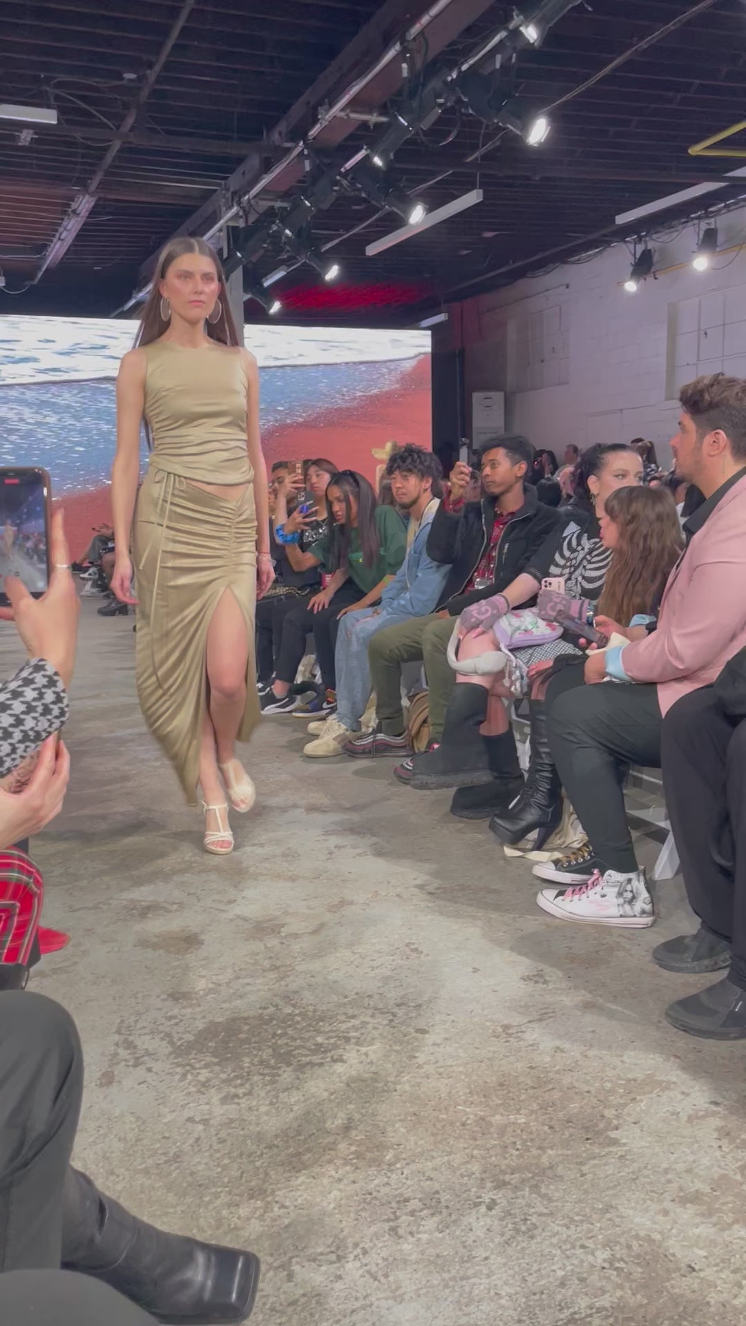 Round neck ruched tank with asymmetric skirt with high slit and ruching. The skirt has an adjustable cord at the waist for security. Fabric is made of a stretch nylon/polyester blend with gold sheen to it.