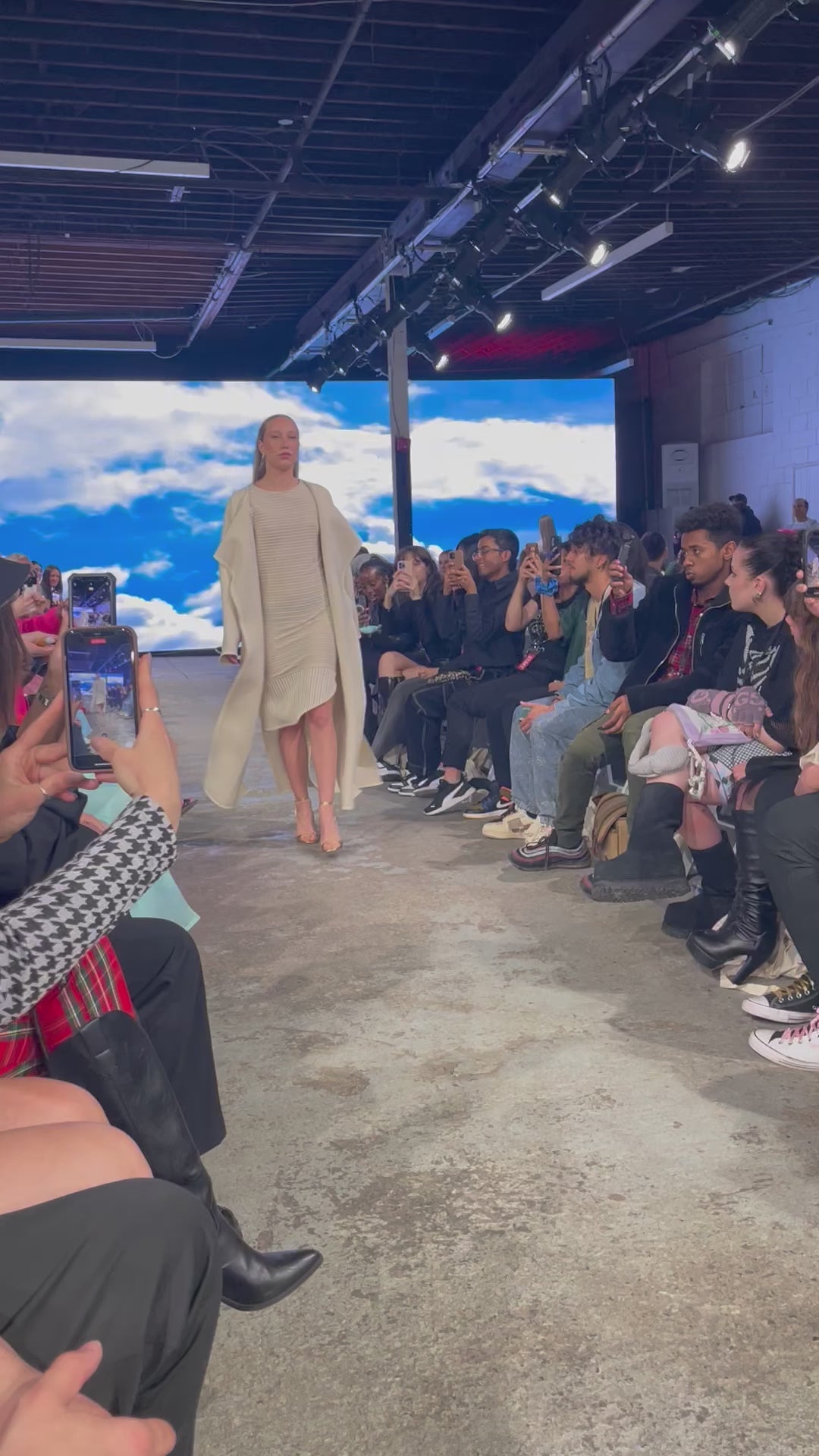 Neoprene coat in cream beige. Large lapel with two pockets. one size fits all (oversized look). Only 1 available. Has slits on sides as well as center back.